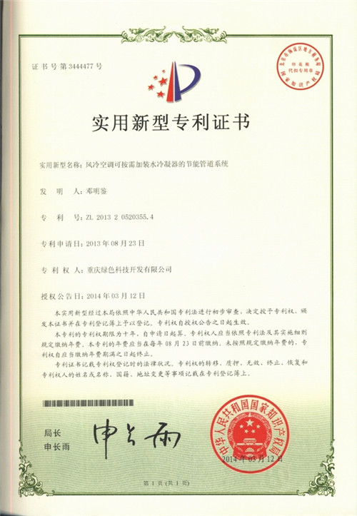 二、“風冷空調可按需加裝水冷凝器的節(jié)能管道”專利技術(專利申請?zhí)枺?01310374752.X)