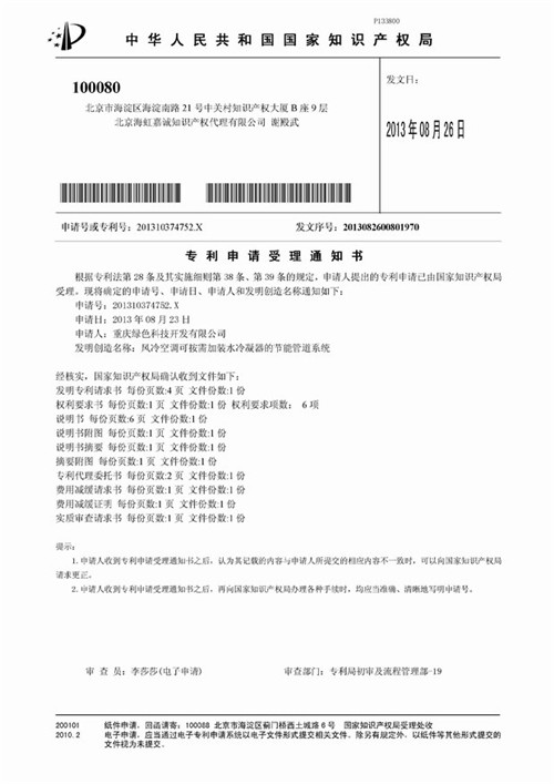 3. 風冷空調可按需加裝水冷凝器的節(jié)能管道系統(tǒng)《專利申請受理通知書》(實用新型專利)復印件